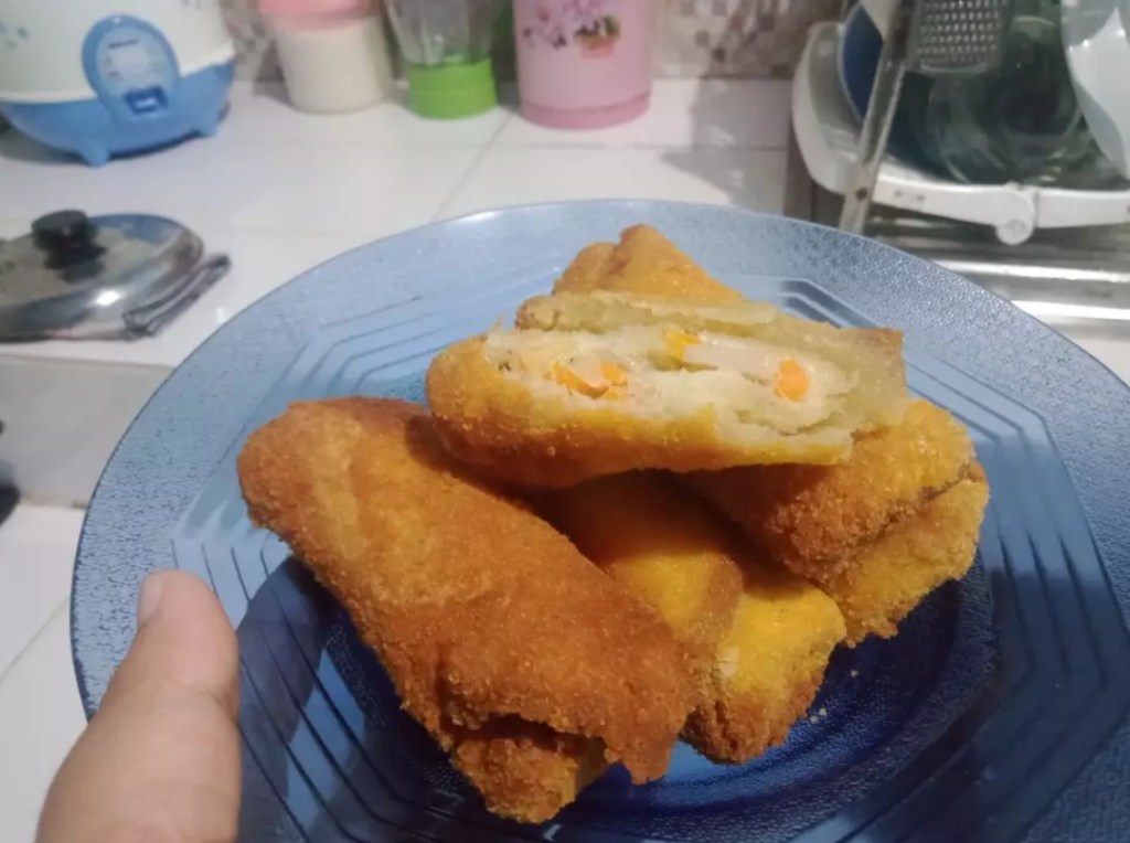 3. Blender tepung roti, siapkan dalam piring, kocok telur lalu gulingkan roti ke dalam telur lalu taburkan dengan tepung roti sampai rata, lalu goreng dalam minyak panas sampai matang dan siap disajikan..